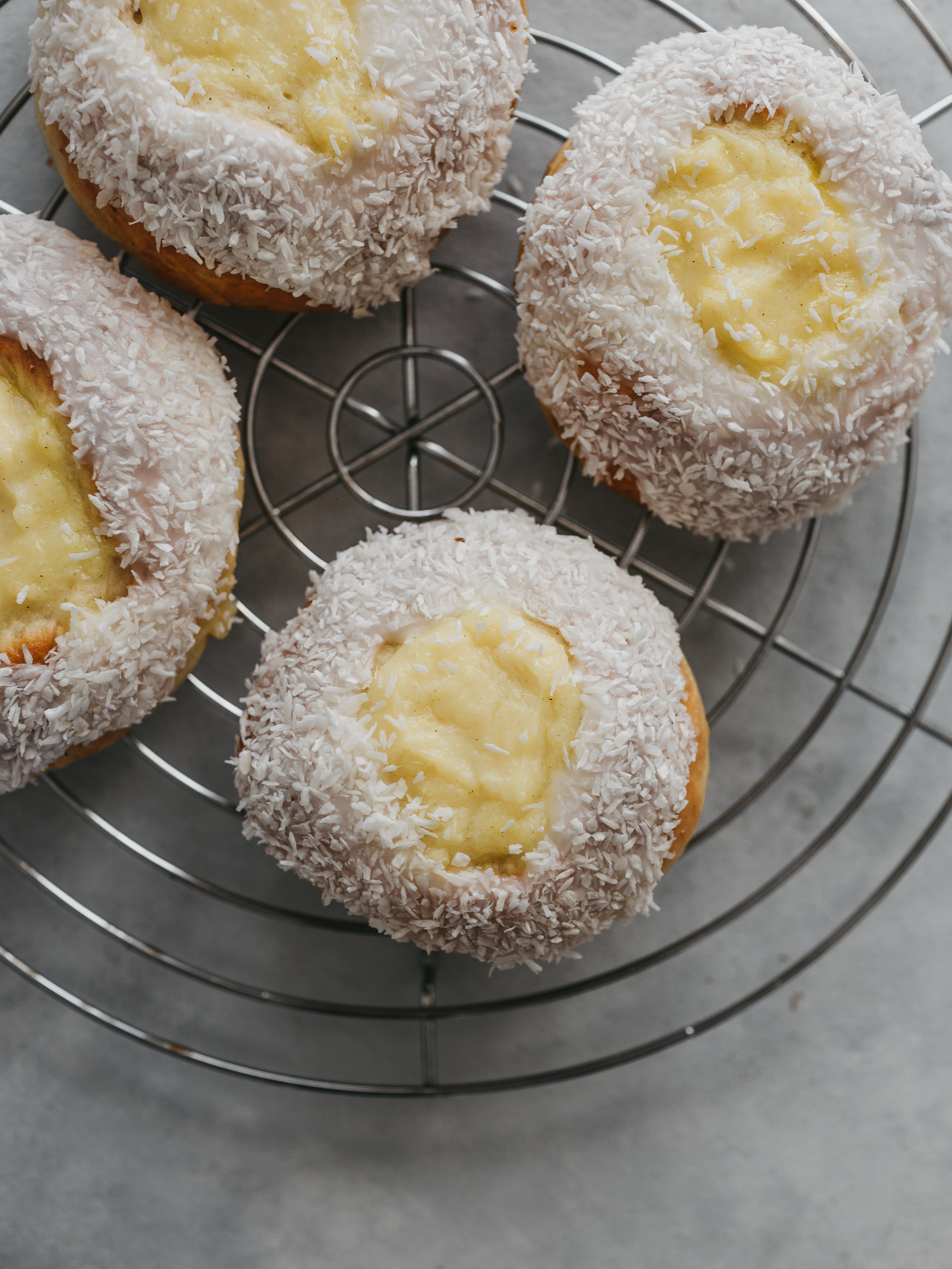 Det som kendetegner en skolebolle er den gule midte af vaniljecreme, og glasur og kokos på kanterne. Jeg plejede altid at gemme cremen til sidst og spise rund om, fordi jeg synes det var det aller bedste. Du kan enten vælge mellem af lave vaniljecremen helt fra bunden, hvilket jeg anbefaler, eller købe den færdig i supermarkedet. Det er nemmere end man tror, og bollerne skal jo hæve alligevel, så hvorfor ikke bruge 15 minutter på at få en ekstra god vaniljecreme.