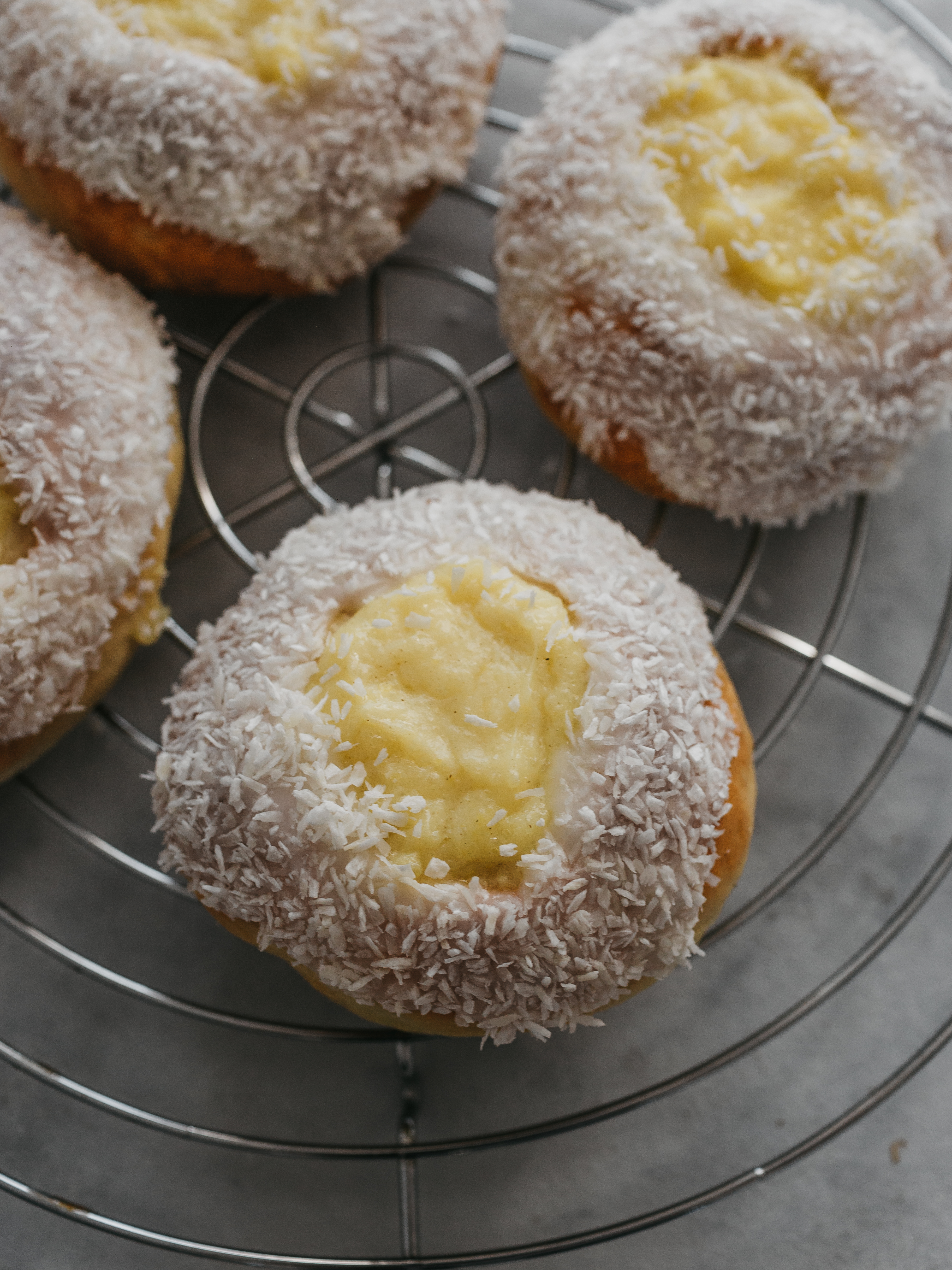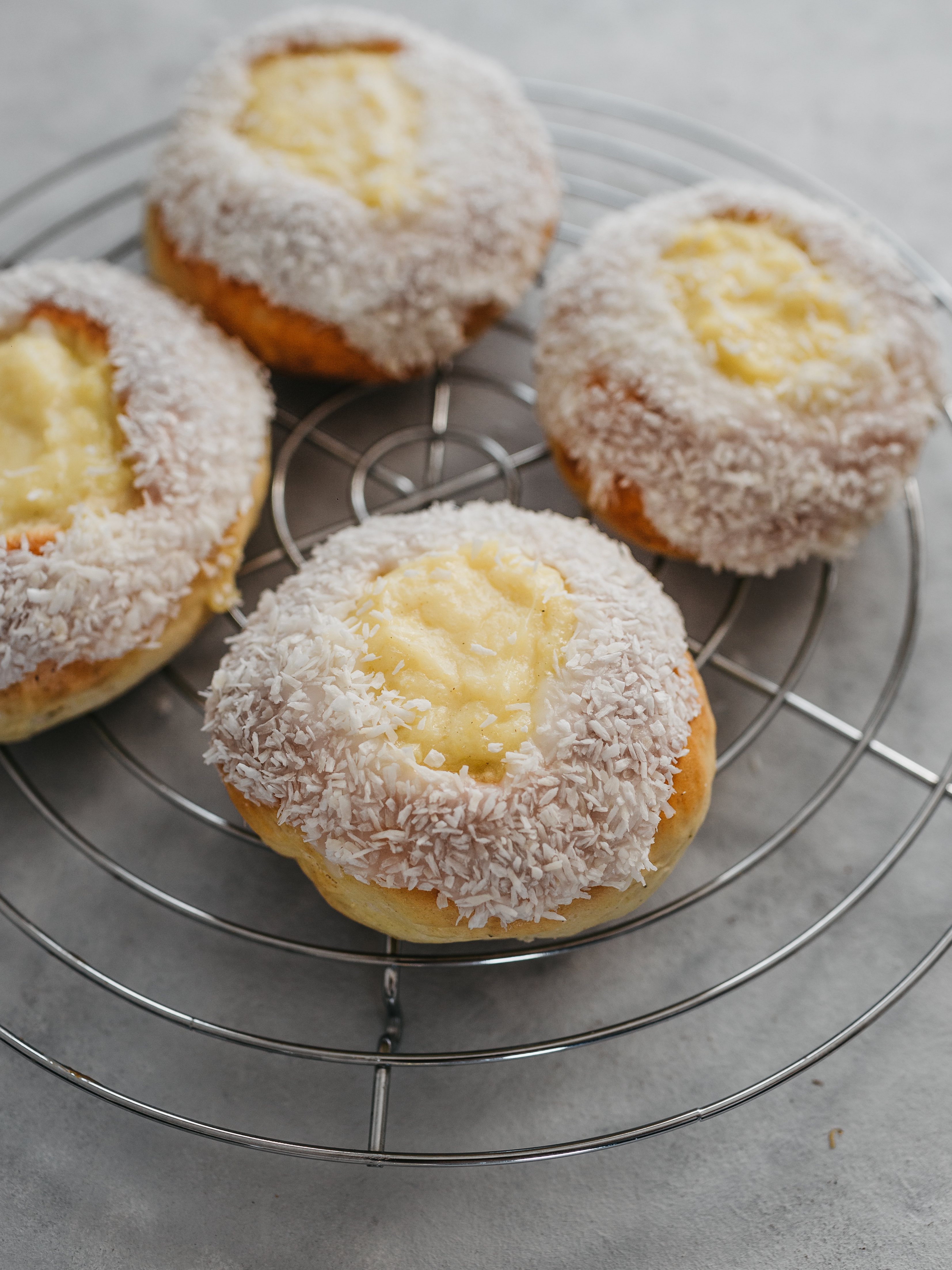 PS! Bollerne kan sagtens fryses. Hvis du ønsker at fryse de ned, så skal de fryses ned uden glasur og kokos - så de kan varmes når de engang skal spises.